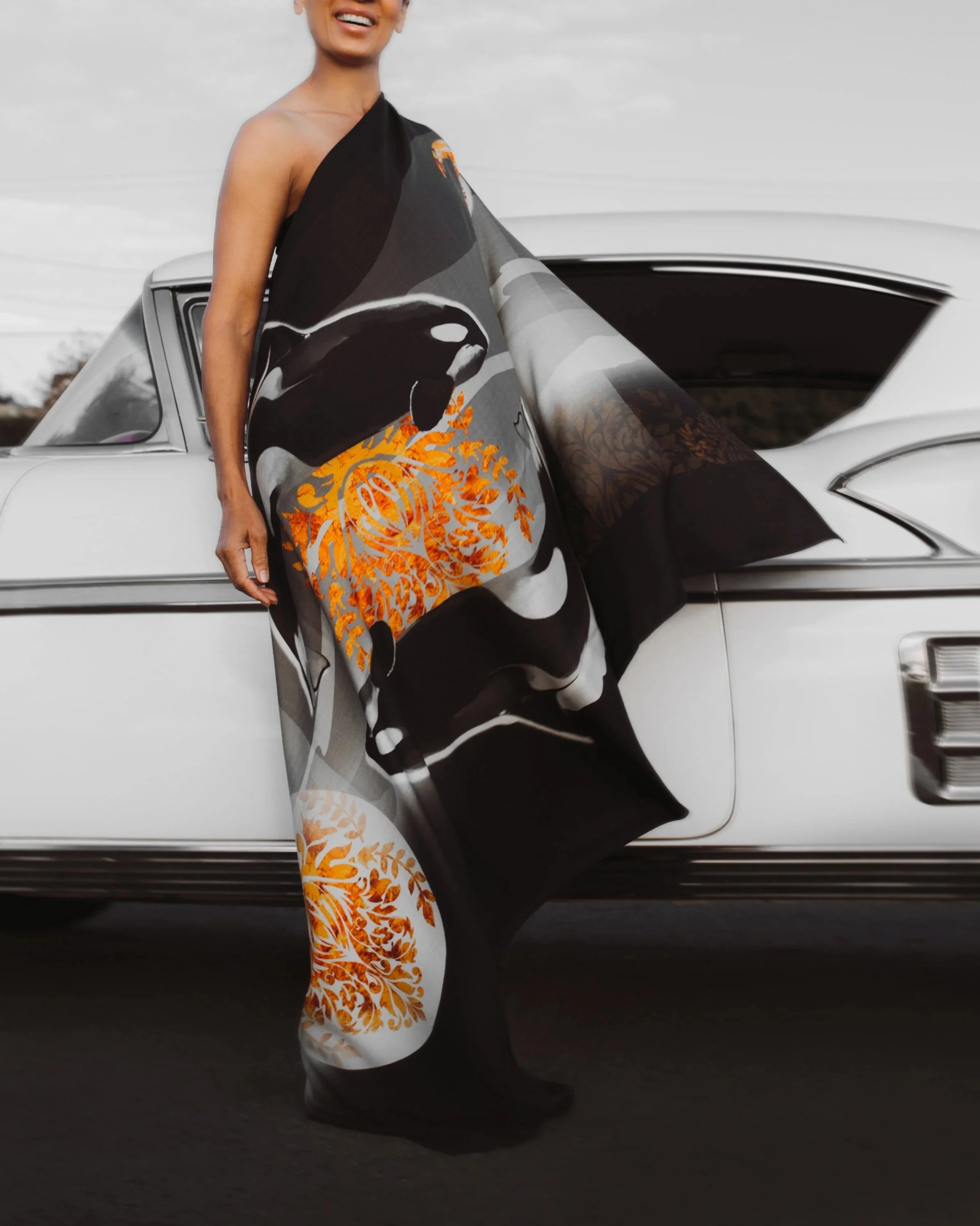 The inspiration for this piece came from winter on the Pacific Northwest Coast, where I live. Winters here are cool, misty, and incredibly beautiful. On the shawl, you can see foggy mountains blending into the ocean landscape, with two orcas at the center, surrounded by the sun, the moon, and ornamental baroque details. These bright accents stand out against the soft monochrome background, adding contrast and depth.