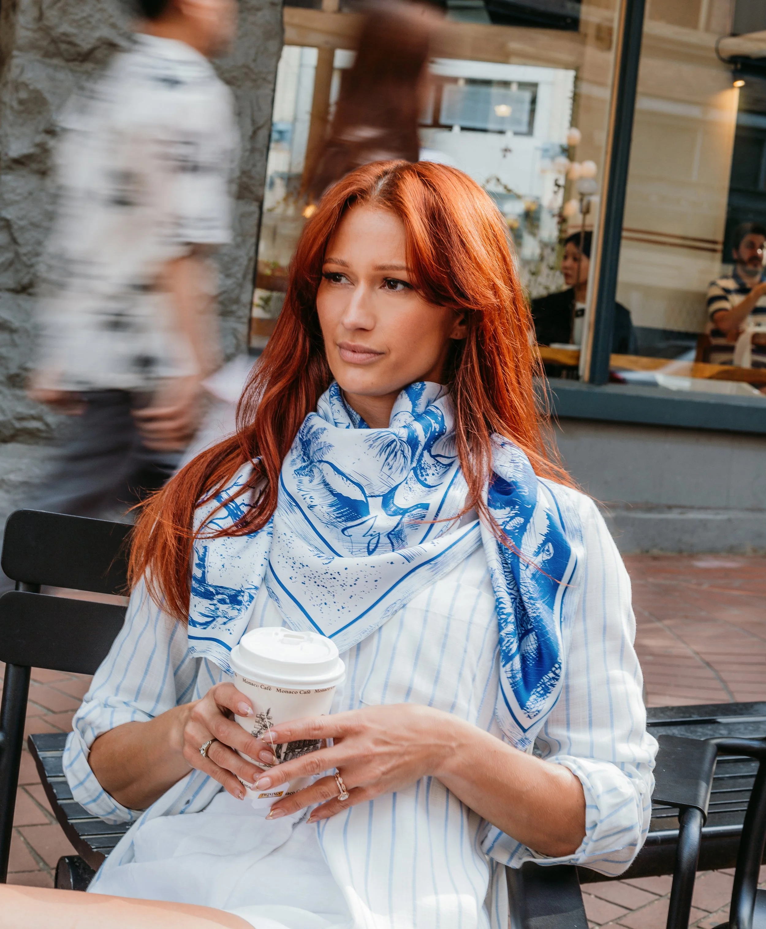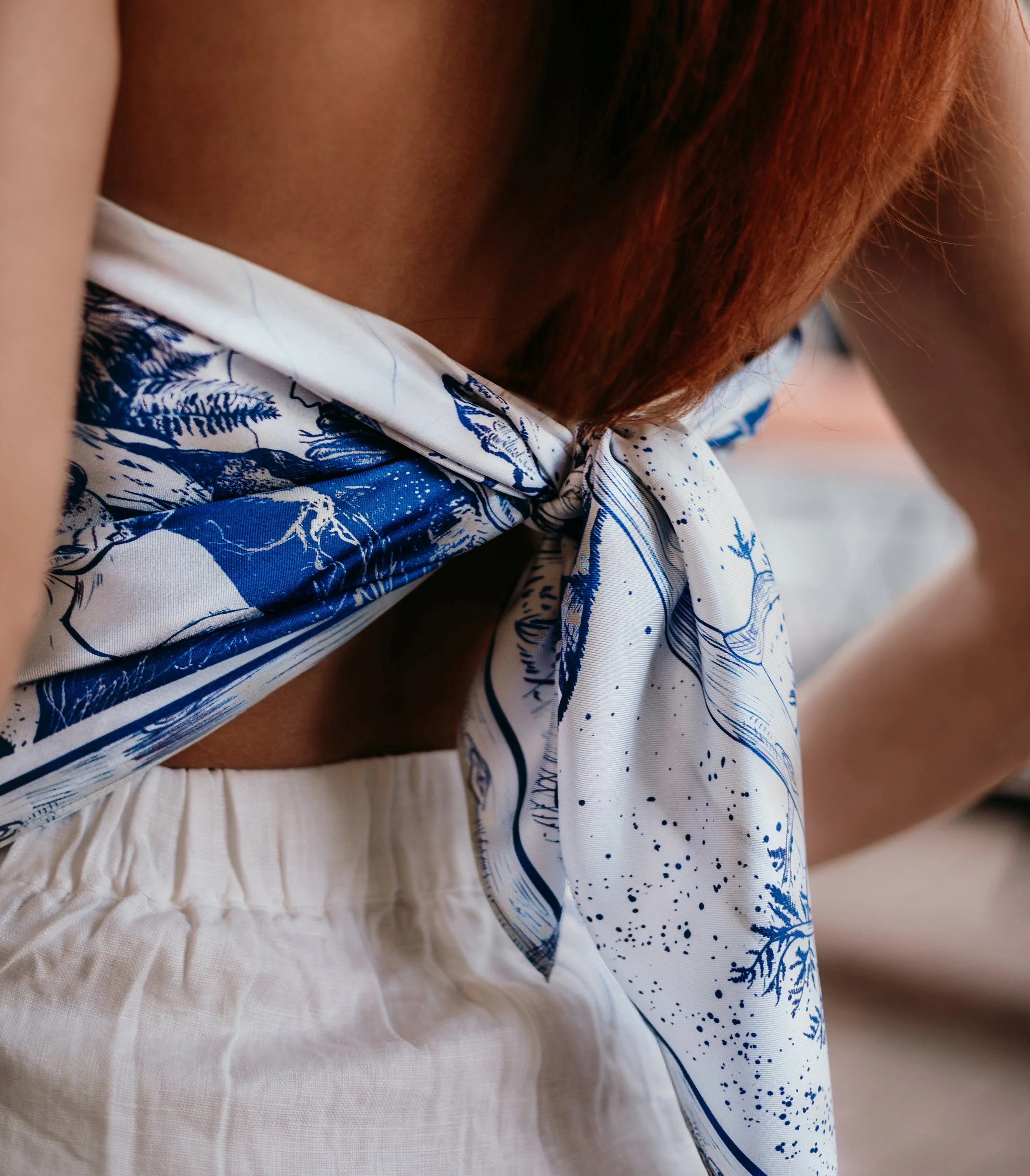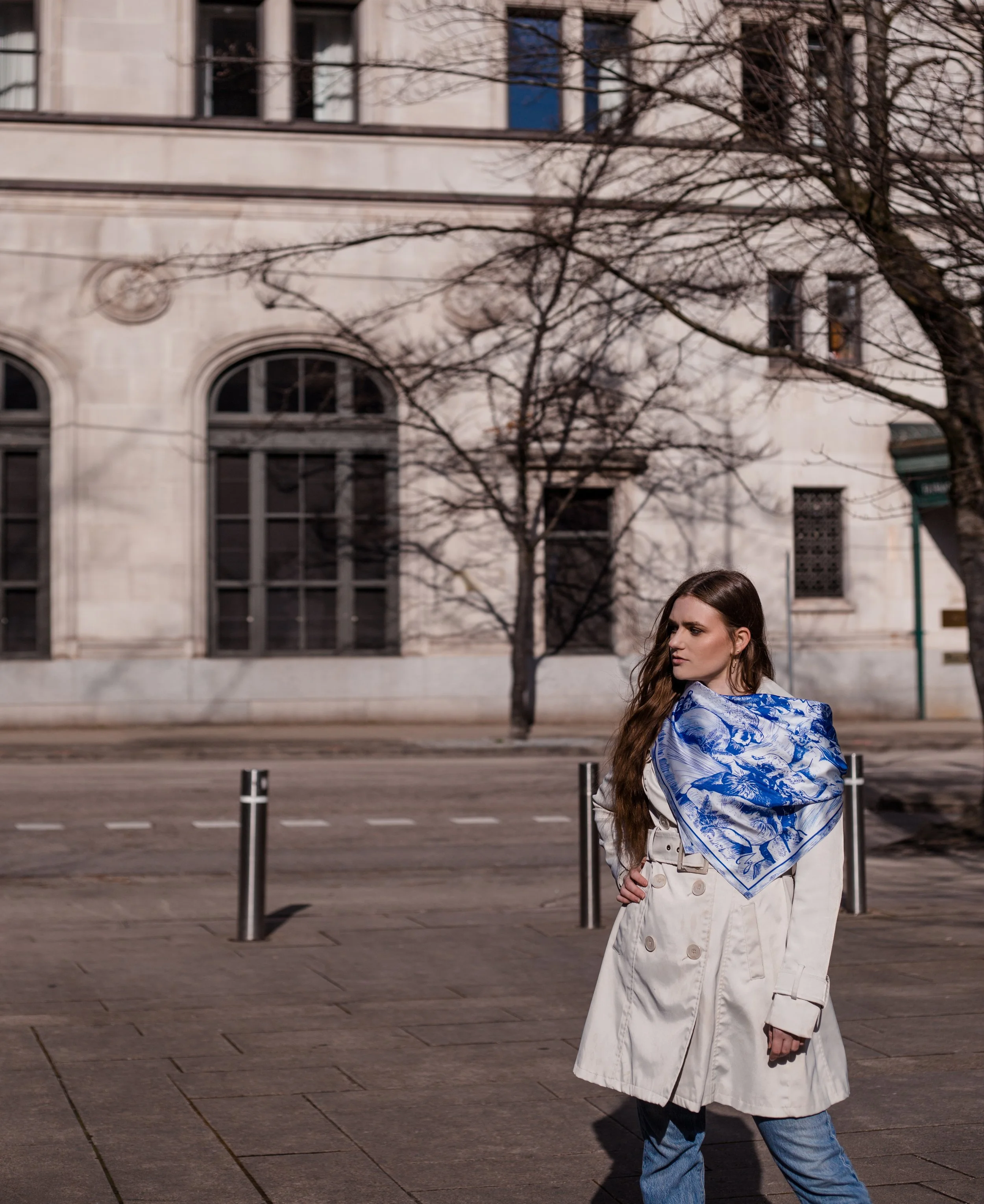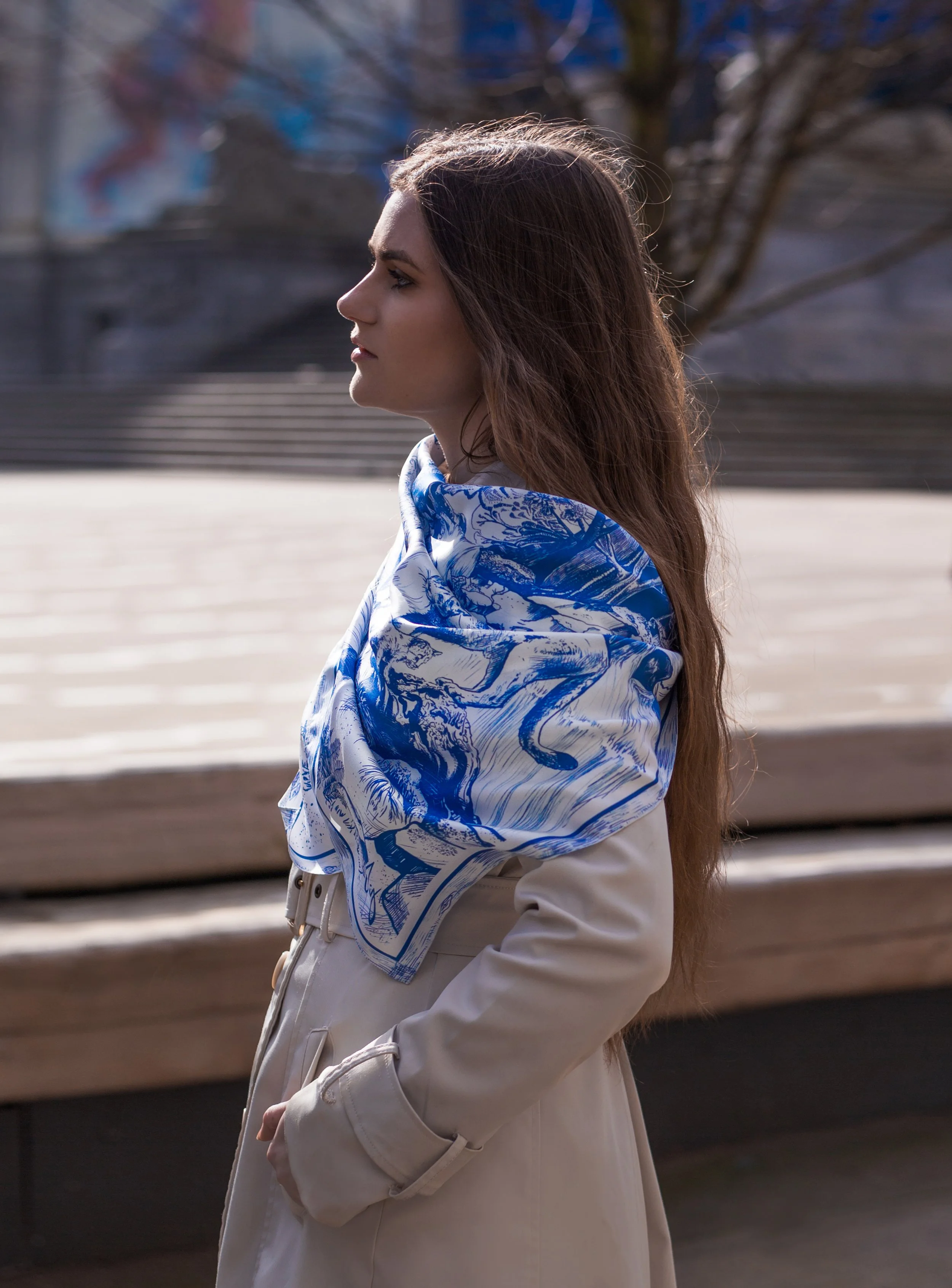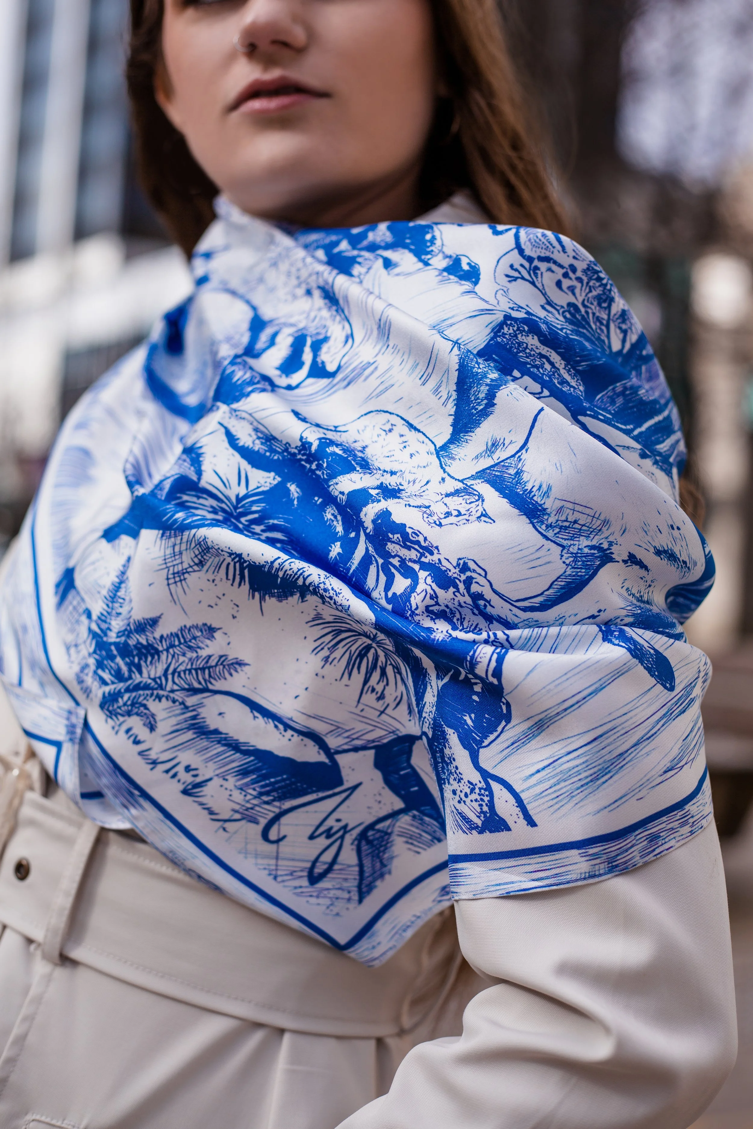 This scarf is a timeless piece crafted to soothe the senses. Made from 100% natural silk, it remains breathable and gentle against the skin throughout the seasons. The white-and-blue palette offers effortless pairing with any wardrobe. Drape it around the neck, weave it through the hair, or knot it to a handbag as a refined accent.