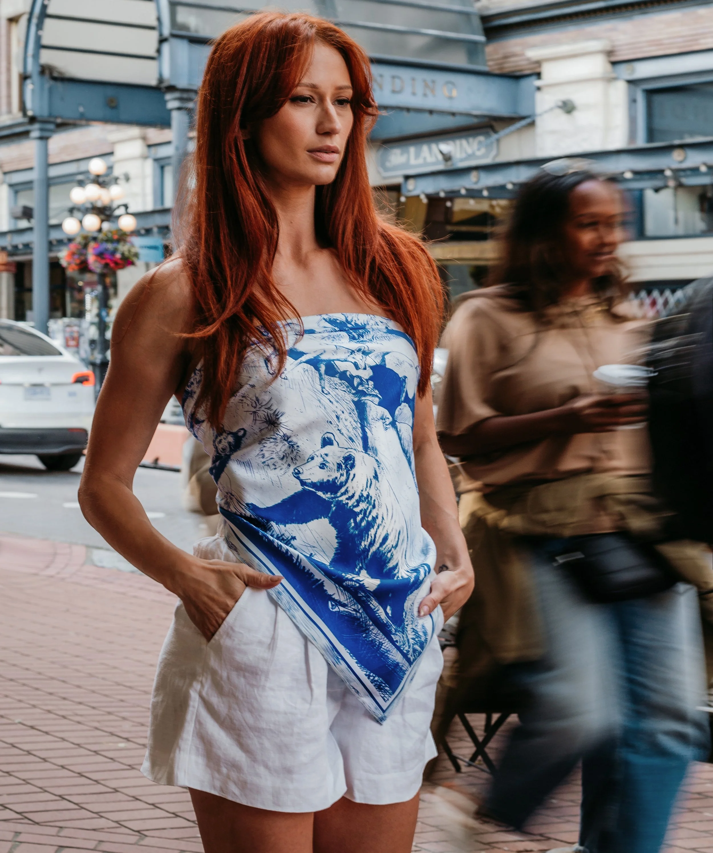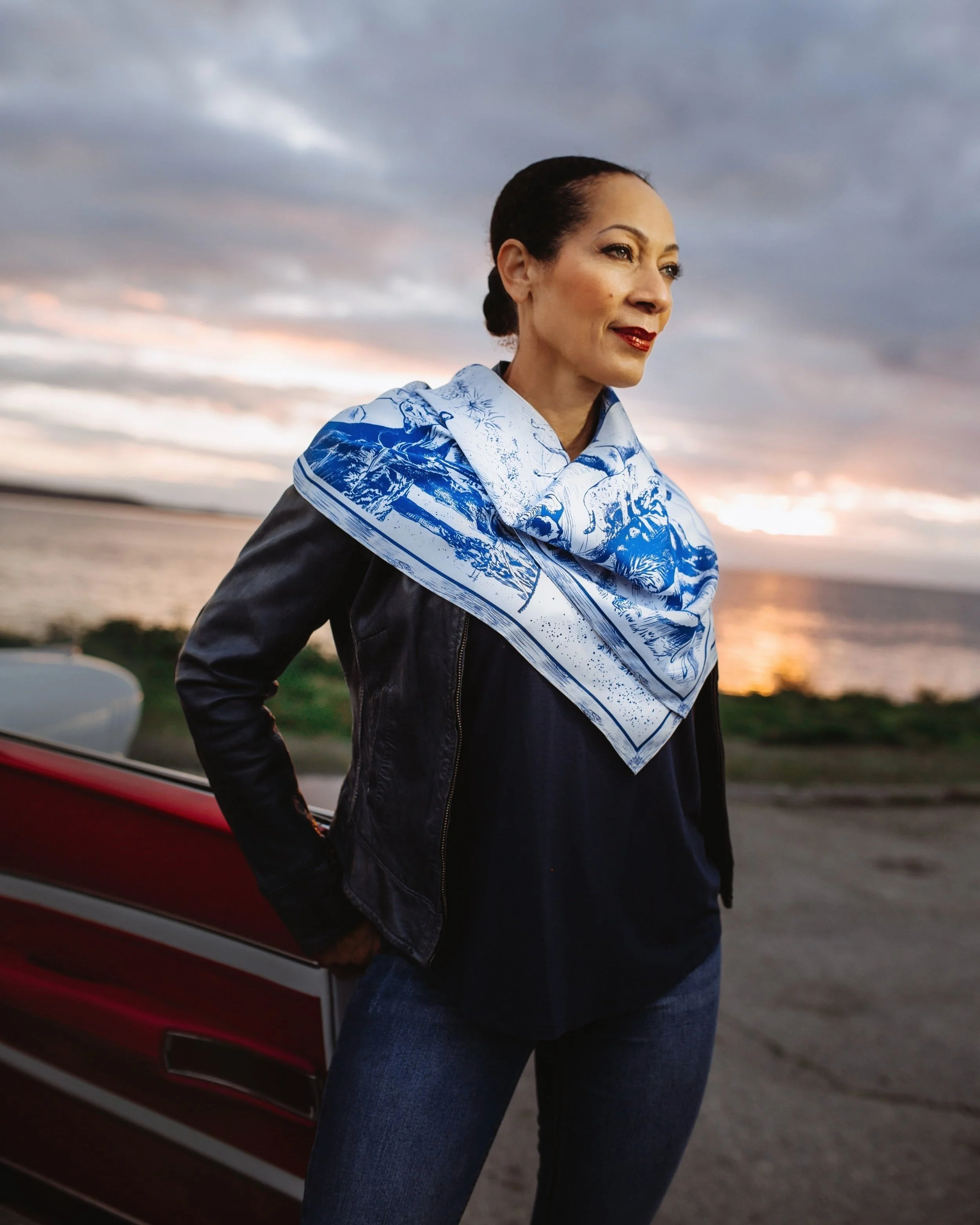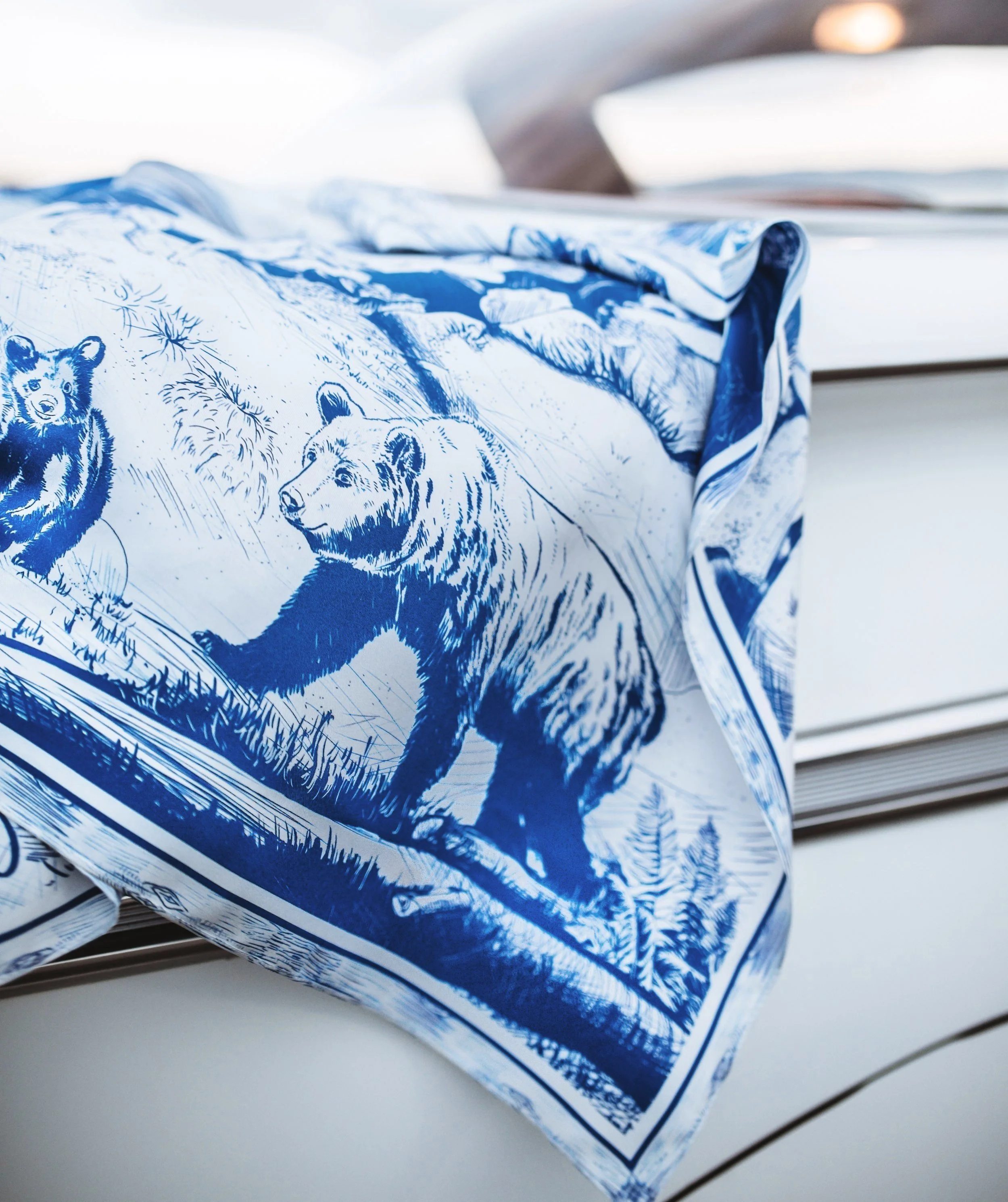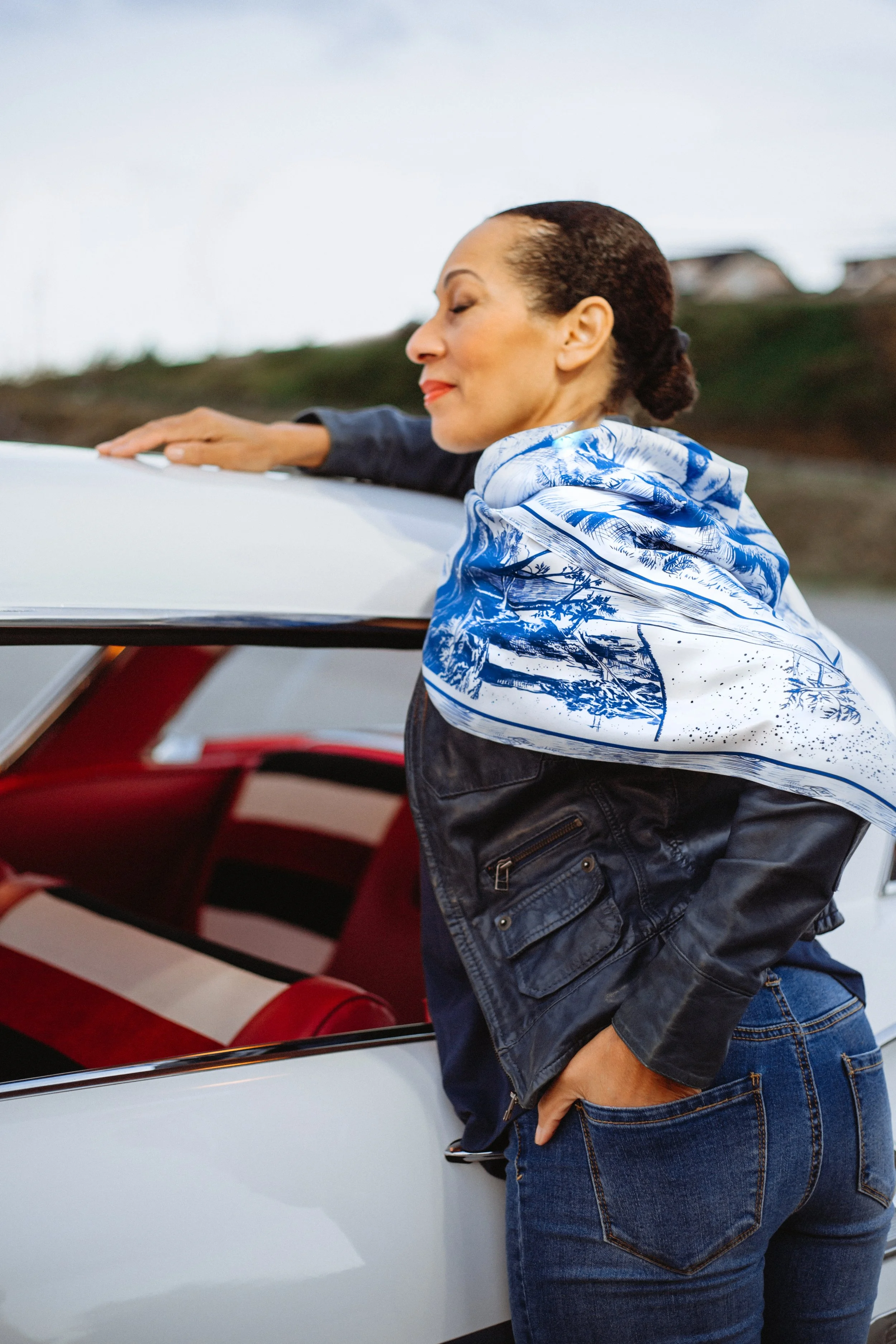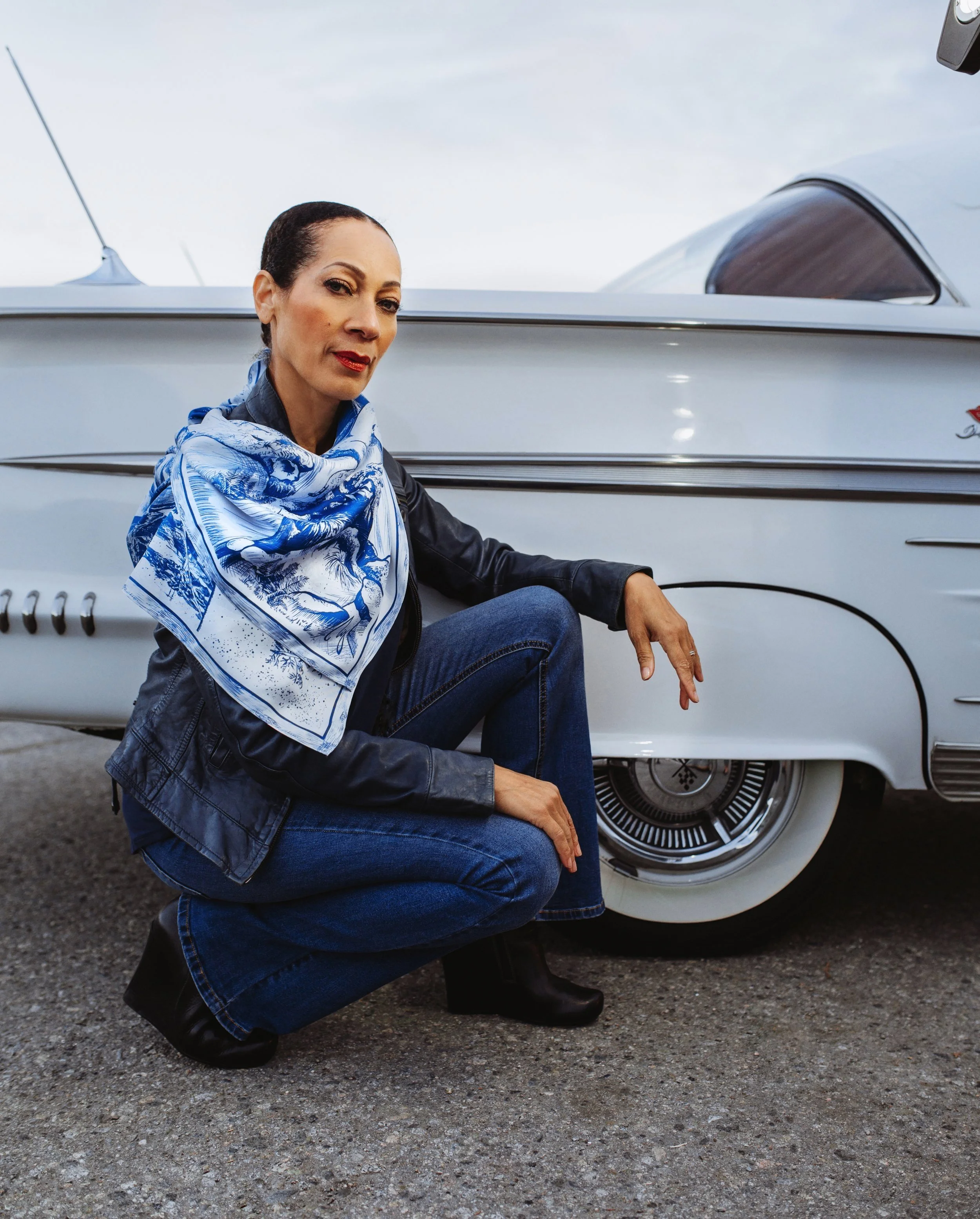 This scarf is a timeless piece crafted to soothe the senses. Made from 100% natural silk, it remains breathable and gentle against the skin throughout the seasons. The white-and-blue palette offers effortless pairing with any wardrobe. Drape it around the neck, weave it through the hair, or knot it to a handbag as a refined accent.
